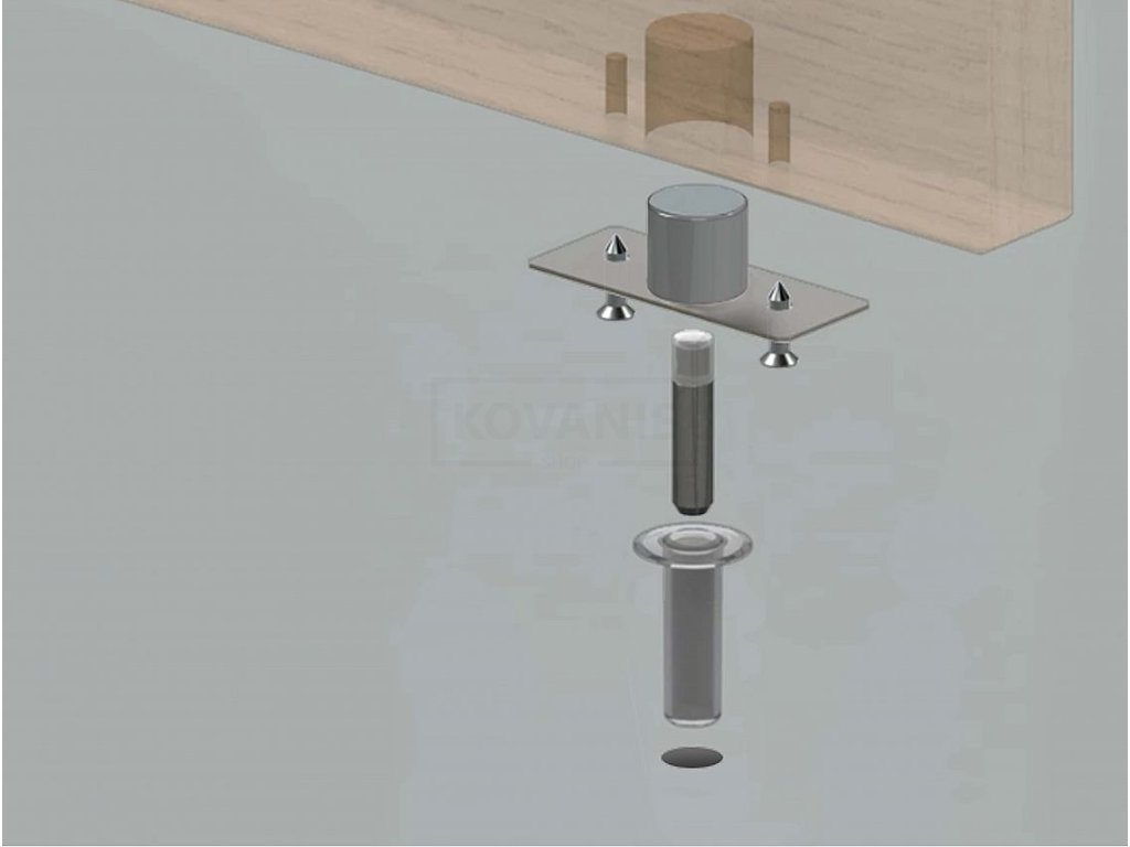 Dverný komponent, ktorý obsahuje silný magnet, sa inštalujeme na spodnú hranu dverí. Dbáme na správnu pozíciu hrany a plynulého prechodu. Potom na patričné miesto do podlahy usadíme podlahový komponent. Do neho sa vložíme pohyblivú zarážku, ktorá je tiež opatrená magnetom.